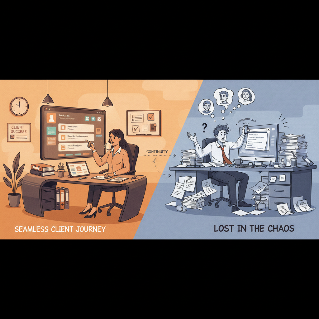 - Informação dispersa: contato no WhatsApp, visita no calendário pessoal, proposta em PDF no e-mail e documentos no drive.